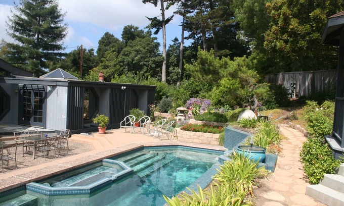 Imagine your own private retreat, close enough to walk to the Mission of Santa Barbara and yet when on the acre property you will feel like you are away from it all in your own private Shangrai Lai. The Frank Lloyd Wright inspired design maximizes the enjoyment of the sprawling one story 3000 sq feet house. The house embraces a spectacular solar heated pool and backyard patio from which you may fully relax in the fantastic Santa Barbara weather. The mottled black bottom pool is like a "Matisse" painting adding to the ambiance of the beautiful yard. Rates include local taxes and fees
