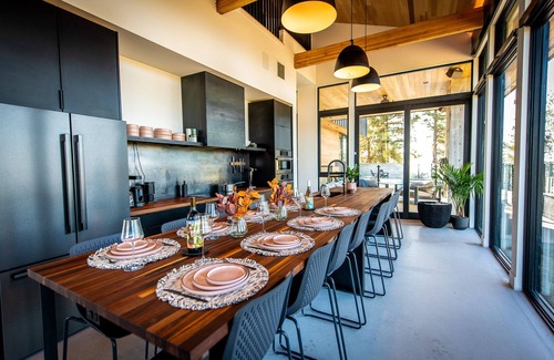 The heart of the home lies in the large open kitchen, where a wall of windows provides unparalleled views of nature at its finest. Whip up gourmet meals with ease, then gather around the dining table island to savor your creations with loved ones.