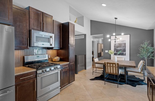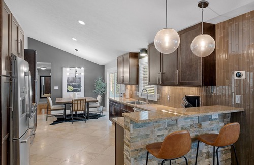 This exquisite home features a range of enticing amenities, including a refreshing private pool for summer enjoyment, a rejuvenating steam shower, and a relaxing hot tub for year-round indulgence. Spanning over 3,200 square feet, there is ample space for you and your guests to unwind before and after the festivities. The property boasts three separate living areas, making it easy to entertain friends and family. One highlight is the unique garage door bar that effortlessly connects the indoor and outdoor spaces, creating the perfect setting for celebration and relaxation.