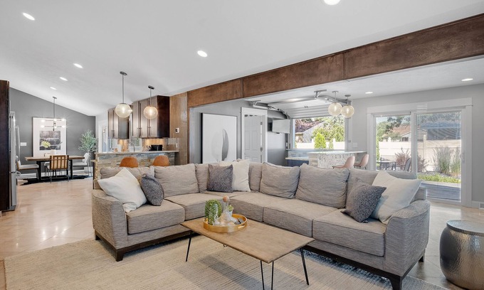 Unique Bar Setup: The garage door bar that opens to the backyard living space adds a playful twist to your celebrations, allowing easy access for drinks during your festivities.