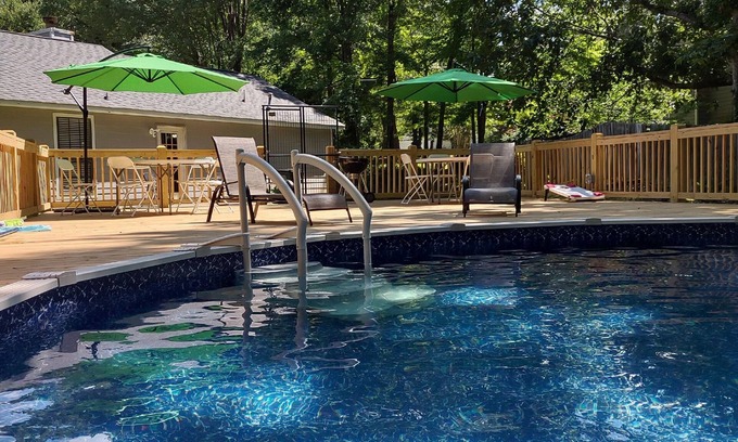 This house has a PRIVATE POOL, with a massive 28x35 feet deck around it. It has a charcoal grill for your gatherings, lounge chairs, corn hole game for poolside entertainment, a basketball hoop for the pool. Book our home now, as it will fill up for the summer!