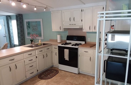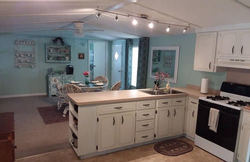 The house is decorated with a coastal cottage feel from the coffee bar to the picket fence headboard in the master bedroom. The living room furniture is very comfortable with and oversized recliner and U-shaped sectional. The front of the house has a glassed sunroom for added seating for your relaxation.