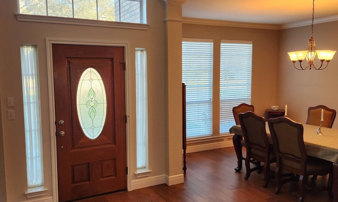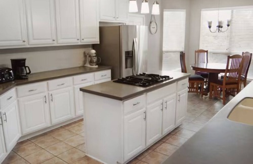 This exquisite house is a family-oriented home, laced with entertainment features to make your stay worthwhile. The 4 BR, 3.5 BA house is proximal to: 183 Highway, I-45 toll-way, Lake Travis, the Domain, and multiple modern entertainment centers. The house features a work-from-home space, an amazing open concept floor plan with extended covered patio, and an inviting pool with a stunning view of a Federal-preserved greenbelt.