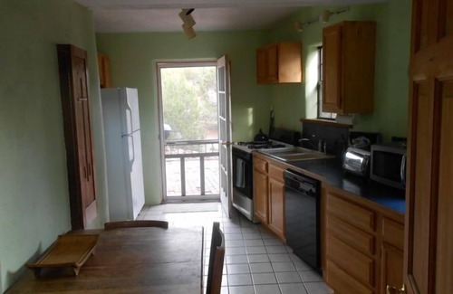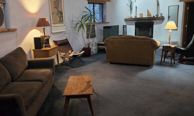 I built the house myself which is adjacent to my main house. Watch the sun rise and set from the adobe meditation tower. Have a dinner party with large dining table and full kitchen. Sink into the goose down couch and rest easy. Santa Fe Style.