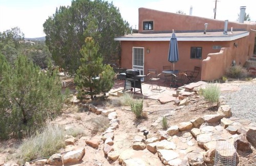 Enjoy the quiet solitude of a rural retreat just a short drive to Santa Fe. Located on a private road on 7.5 acres you can relax by the fireplace in the comfortable living room or under the stars on the private patio. One bedroom sleeps two and a loft with mountain views sleeps additional 2 or more.