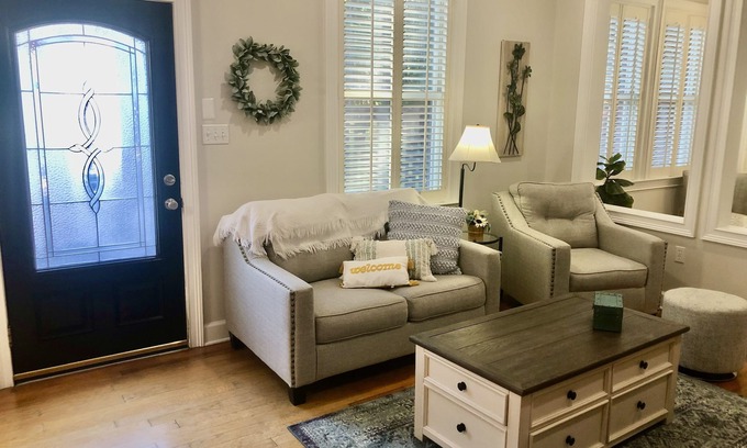Cute, open concept cottage with an inviting living room, comfy couches and fireplace for those cool winter nights. Kitchen has all the basic necessities. Ample sized rooms and spacious walk-in shower in master bath. Office setup with wifi, desk and printer for those needing to work. Great private backyard with bbq pit, deck, patio and lighting. Acres of trees with landscaping. Great place to take a walk or go to the nearby lake and watch the geese and fish. Close to downtown, shopping, historical attractions and restaurants.. Perfect spot to relax and enjoy this magical place!
