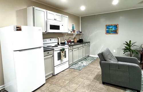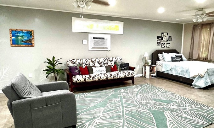 Away from the hustle and bustle of the city, but minutes away from the beach. This is your quiet and peaceful sanctuary for relaxing and unwinding! Entire detached guest house for your enjoyment. Well equipped kitchen with stove, range, microwave, full size refrigerator, coffee pot and toaster oven. Includes queen bed, sofa (queen bed), and loveseat (single bed).