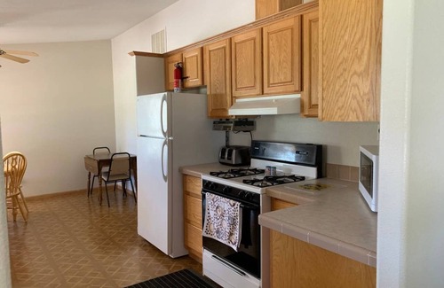 This 3 bedroom and 2 bath home will be your private space. In the living room there are incredibly comfy couches with 4 built-in recliners. There is also a table with a cabinet in it that has some games, cards, and a few toys inside to entertain your crew while dinner is being made. The smart TV only accesses a few local channels so Roku and a Netflix account has been set up for guests to enjoy. You may also use your personal login to any apps you may have. The full kitchen has seating and dinnerware for 10. (a main table for 6 and side table that seats 4 with extra chairs by request) There are pots/pans, a crockpot, griddle, toaster, mixing bowls, kitchen utensils, can opener, grater, knives, cutting board, basic seasonings, and plenty of pantry space for your groceries. There’s a bbq outside and inside the back door, you’ll find bbq utensils hanging on the wall. This is also the laundry room where there’s a washer and dryer with detergent, liquid fabric softener, bleach, and dryer sheets for your use. You’ll also find an iron and ironing board and vacuum. A broom is located next to the refrigerator in the kitchen.