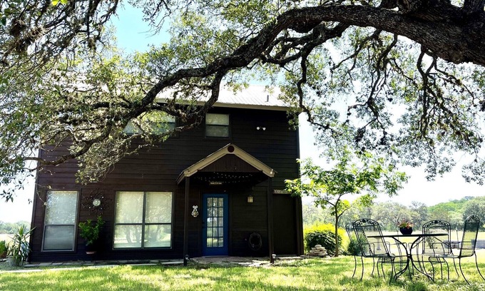 Looking for a comfy place to stay surrounded by country air, rolling pastures and breathtaking sunsets in the Texas Hill Country? Come to our ranch to find peace and tranquility....your home away from home. Our family-owned ranch dates back to 1920 with the original rock home and outbuildings still in use. Your own quaint, solid redwood cabin is nestled amongst mature oak trees. A fully equipped kitchen, seating area, TV and half bath complete the open-concept downstairs. Make your way upstairs to a large bedroom, workstation, reading nook, full bath and private balcony offering endless Hill Country views. A short walk outside and you can explore the largest oak tree in Bandera County and the 8th largest in the state of Texas! Spanning an impressive 116', the canopy allows visitors to enjoy plenty of shade, breeze and relaxation. We are pet friendly and offer a kennel for your pet (if needed) and stalls for horses with turnout area near the cabin. We also have a large practice arena for your use. We are situated in the Texas Hill Country just a short drive to Bandera (6.5 mi), Boerne (21 mi), Fredericksburg (56 mi) and San Antonio (45 mi). Plan your stay today and make memories for tomorrow!