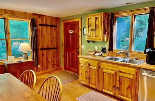 This charming private retreat is nestled among Maples, Birches, and Firs with a view of Howard Pond. The tastefully remodeled three-bedroom, two-bath cottage sleeps six with two queen beds and two twin beds. The inviting open living/dining/kitchen features a vaulted cathedral ceiling with roof windows that allow light to fill the home. The 6' pine dining table accommodates everyone.