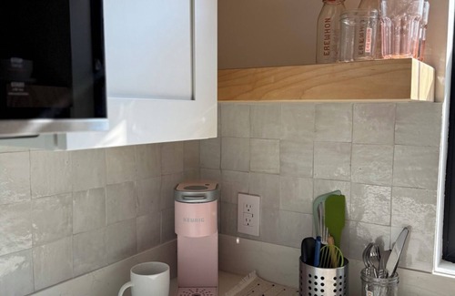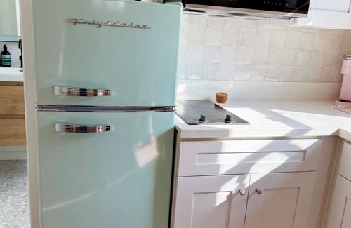 -Fully stocked kitchen, 2 burner stove, microwave, retro fridge, touch activated faucet.