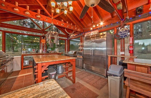 The retreat's extensive amenities make it truly unique. The Main Lodge features soaring ceilings with 40 ft. walls of windows, allowing natural light to flood the space and create a warm, welcoming environment. A fully equipped kitchen, oversized dining area, and cozy great room with a stone fireplace ensure perfect entertaining opportunities. Your outdoor wedding dreams can come true on the expansive entertainment patio, complete with a decorative arbor for ceremonies and stunning views of the meadows and hills. You will also enjoy luxury features such as a hot tub, pool, and recreational options like frisbee golf and horseshoes, making it ideal for pre-wedding relaxation and activities.