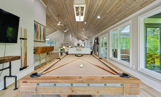 While some of your group relax around the TV, others can enjoy a game of pool on our rustic slate bed table which has another large mounted TV and live edge bar top to rest your drinks or charge your phones at.