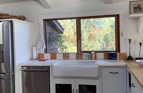The House: Enter through courtyard garden with culinary and medicinal herbs. Open plan living and dining opens to patios and expansive views. High wood beamed ceilings throughout, hardwood floors, fireplace, excellent spacious and well equipped kitchen with Thermador range. Adjacent utility/ pantry room. Guest powder room. Large master bedroom en suite, queen bed with Hastens mattress for ultimate comfort. Library-den with a cozy daybed can accommodate an extra guest as a second bedroom. A third bedroom and bath with separate entrance may be included for additional fee. Outdoor dining areas, BBQ. Relaxed unmanicured meadow garden in private side yard.
