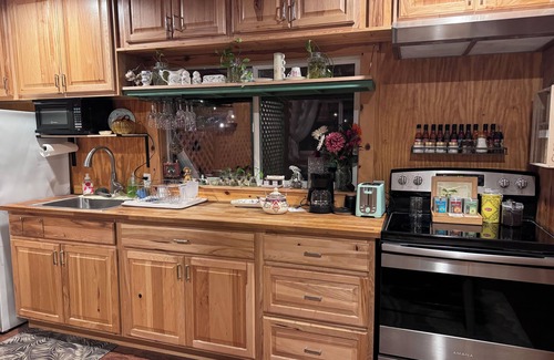 Nestled in the woods, our cabin offers direct access to a serene creek—perfect for wading, swimming, fishing, or simply relaxing by the water. Enjoy outdoor seating with beautiful views by the creek.