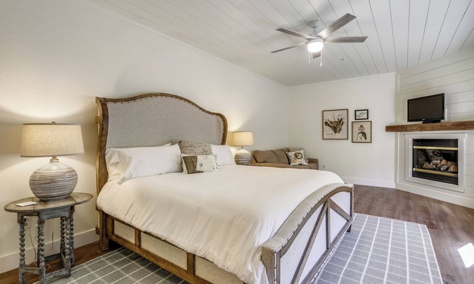 Enjoy the plush king size bed, 12" memory foam mattress under crispy white bedding and a gas fireplace within a shiplap facade and barn beam mantle. WIFi and cable TV are readily available in your room.