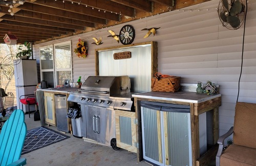 Private room on Lakefront home. Walk down to a covered dock with access to kayaks, pontoon, and jet ski. Swimming in nice seculded cove. Bass and crappie are plentiful in the 500 acre lake.. You have an outdoor kitchen on a covered patio with a beautiful fireplace and hottub.