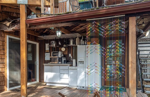 It's situated to be rustic and inspirational, nestled into the back corner of a deep lot. There are fruit trees all around and a seasonal pond that attracts ducks in the spring and early summer. Depending on the season, you can listen to birds and frogs from inside the roundhouse, or cross the footbridge to the south-facing deck behind the workshop -- another private space for your "get away from the bustle" contemplations. Or enjoy the firepit.