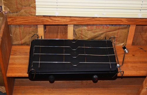 This is a rustic cabin - no plumbing or electric. It has battery-powered permanent lighting and propane heat. Our summer climate and tree cover make it very rare that the cabin will be uncomfortably hot. Included in the rental are a tabletop propane stove that uses the (approximately) 1 lb canisters, and a charcoal grill. Bring your own propane canisters or charcoal, or you can purchase them from us.