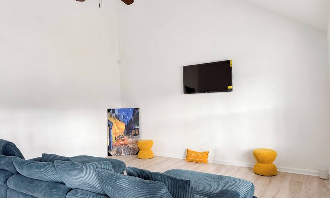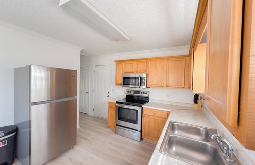 Recently upgraded and fully furnished throughout, this spacious and private three-bedroom home features an open floor plan with a modern kitchen, dining area, dedicated workspace, and a living room with 50” Smart HDTV.