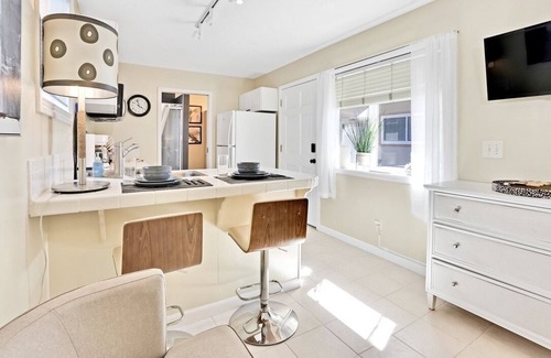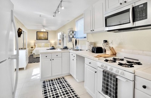 Fully appointed kitchen with appliances, including stove, oven, refrigerator, coffee maker, and microwave. The bed is comfortably furnished with fresh crisp new linens, pillows, and coverings. Other amenities include free high-speed WiFi, paid laundry area, an outdoor seating area, onsite parking, and keyless access.