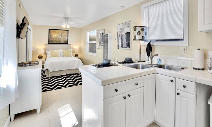 Recently upgraded and beautifully furnished throughout, this spacious and private one-bedroom studio apartment features an open floor plan with a full kitchen, counter-height seating, a dedicated workspace, and a living room with 32” Smart TV.