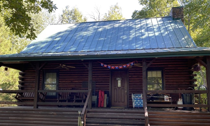 PRIVATE!! Beautiful log cabin secluded on 16 acres near Glendale Fish & Wildlife. 2 acre lake for fishing/pedal boat/kayak/swimming. Pond is well stocked for fishing & great for relaxation. Large covered front porch, hot tub outside basement with additional outside firepit, outdoor firepit with picnic tables, full basement with sectional seating, indoor fireplace. Accommodates 6 people in beds/pullout sofa but also additional sleeping area in basement. Washer/dryer, dish network tv. Perfect to unwind! Please bring your own firewood. If you want to use fire pit. You can use the cabin/lake area but do not go wondering around on the rest of the property or neighbors. There could be hunters in the tree stands on adjoining property and you will put yourself in danger. Do not move any furniture