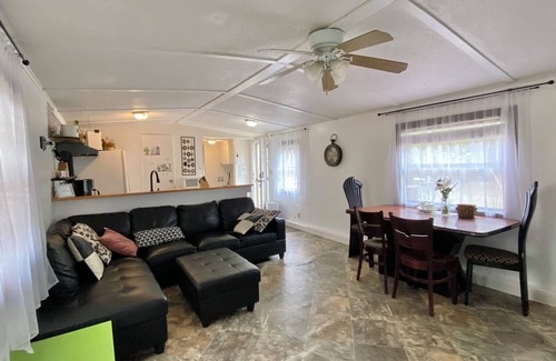 585 sq. ft, single wide mobile Home has everything you’ll need for comfortable , low key stay, fully equipped kitchen, living room, dining table, comfortable beds, a/c ( heaters) in every room, bathroom with tub. Plus large yard to enjoy the outdoors. Fire pit, bbq charcoal grill, hammocks, tether ball and plenty of seating under the stars