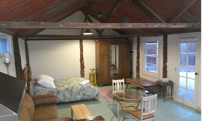 In building this studio we took inspiration from the historic "cattlemans' huts" in the Australian Snowy Mountains. Originally the building was a horse stable, back in the 1920s, the original cypress round posts are exposed. The studio has private access via the rear lane
