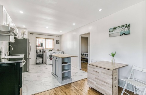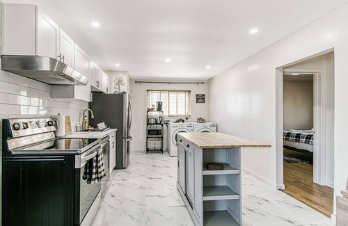 The 3 bedrooms each feature a comfortable queen bed and a personal closet, with 2 of the rooms also including a laptop-friendly workspace complete with a comfortable chair and table, making it ideal for guests working from home or studying. The bathroom includes a shower/tub combination and fresh towels for each guest. Additionally, a washer, dryer, and laundry supplies are easily accessible in the kitchen area.