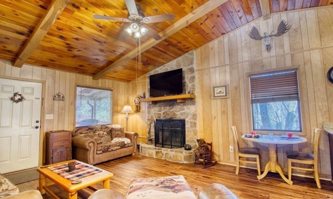 Cabin: The cabin features 2 bedroom and 1 1/2 baths. The TVs, located in the living room and king bedroom, stream your entertainment. There is no traditional cable in the cabin. The fully stocked kitchen includes a dishwasher as well as equipment such as a crockpot and George Forman grill. Enjoy relaxing on the deck off of the kitchen or the covered front porch. Don't forget the wood burning fireplace!