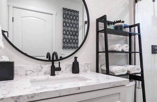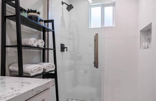 The space is completely private but is attached to the main house so slight noise is possible. As you walk in you are greeted by a compact but well equipped kitchen (sink, fridge, electric stove top, and microwave) and a dining table beside it. The memory foam queen bed is lined with plenty of pillows and blankets to meet your comfort needs. The 58inch TV can be seen right from the bed or the cozy couch. The bathroom has a new modern look with a spacious stand up shower. Plenty of natural light enters, combining perfectly with the natural tone colors and vibrant plants, to give the room a pleasant and elegant look. No parties, drugs or smoking allowed. The studio shares a wall with the main house. There is an exterior ring camera facing the studio entrance.