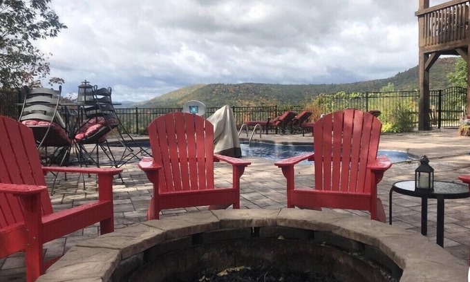 For rent is the entire 1,200 sqft ground level meticulously clean new apartment of this beautiful mountain top place. You do not rent the entire house just the apartment below but everything is private (parking, patio, pool, entrance etc) for your group. Includes private use of a 80F degree heated pool (except in late-September thru May when it will be closed), brand new (in 2024) cedar outdoor shower, patio and fire pit area. You also have your own private entrance and parking area. The kitchen has a microwave, toaster oven, keurig & traditional coffee maker, frig/freezer, hot plate, electric griddle, all plates, cups and utensils, pots and pans, cutting brd, wine opener, bbq tools, etc. It does not have an oven or dishwasher but everything else. The patio has a gas grill and large table for 6, tall bar table for 4, 4 sun loungers, 4 Adk chairs, wireless outdoor speakers & pool toys. The campfire on the patio gives a true Adirondack experience. Evening sunsets are breathtaking. Hosts supply the wood for campfire. The home is on a very quiet cul de sac which allows for children to ride bikes, scooters, or skateboards.