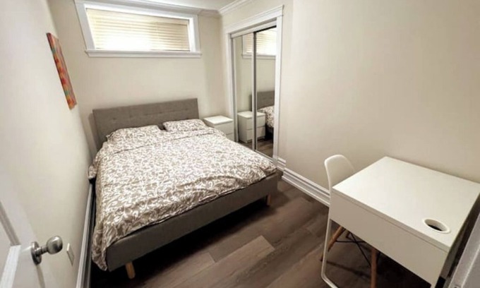 The suite is located on the basement floor (plenty of windows) with a separate entrance. The bedroom has a queen size bed, desk and a full closet. Pictures do not do the justice!