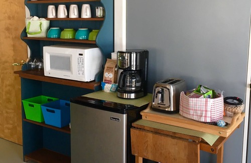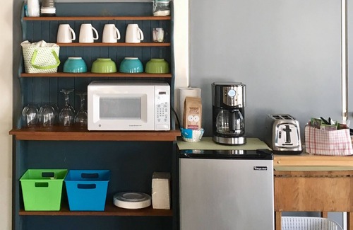 A queen bed sleeping nook is adjacent to the living space with a privacy screen. An additional private bedroom has a double bed and single mattresses. The Suite is similar to a large hotel suite. If you want complete privacy from your fellow occupants this is not your best choice. However, it's a great place for families and close friends. There is an ensuite full bathroom. The suite DOES NOT have a kitchen. It DOES have a microwave, coffee maker, larger mini-fridge, and toaster, and is stocked with glassware, etc. No kitchen, no worries, you will be just two miles away from so many amazing places to eat and drink that you will not want to spend time cooking. Shelburne Falls has some of the top-rated eateries in the state even though we're a small town.