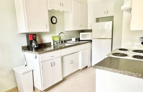 Fully appointed kitchen with appliances, including stove, oven, refrigerator, coffee maker, and microwave. Bedrooms are comfortably furnished with fresh crisp new linens, pillows, and bed coverings.