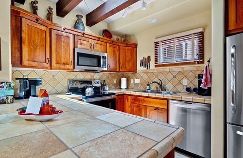 Casa Garvey is a beautiful casita in an idyllic setting. Twelve minutes from the Santa Fe Plaza, both far enough yet near enough to the city to be just perfect, set in an attractive development of the Tesuque foothills two miles above Tesuque Village, ten minutes from the Santa Fe Opera. Across from the entrance to the development is the Four Seasons Luxury Resort, Rancho Encantado. The casita has the charm of the classic Santa Fe style, with transformed kitchen and baths. It's wonderfully comfortable in all seasons, with delightful patios to enjoy in the warmer months and Kiva coziness when the weather turns cooler. From the spacious patio take in the gorgeous views of the high desert hills and beautiful mountains. Santa Fe Baldy is in view, and an incredible nighttime sky. Beauty and serenity abound while being minutes away from restaurants, galleries, shopping, and plenty of outdoor activities.