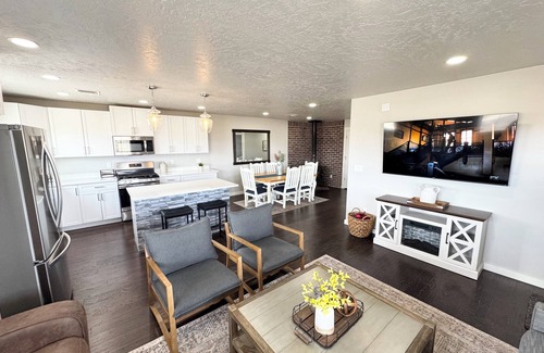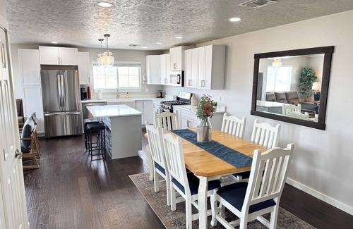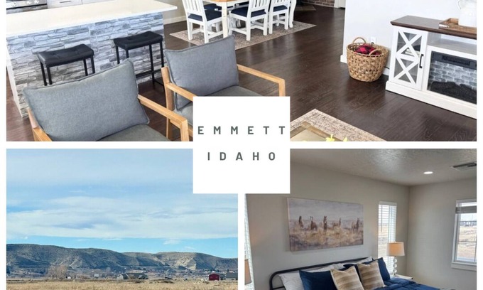 Escape to a serene 3-bedroom, 2-bathroom retreat in Emmett, Idaho, beautifully remodeled and set on a sprawling property. Surrounded by stunning mountain vistas and equestrian charm, this family-friendly haven blends comfort and allure. Relax by a cozy fireplace, watch movies on two TVs, or play in the game room with pinball and arcade classics. Spacious bedrooms with plush beds and modern bathrooms ensure rest. Sip coffee while gazing at mountains or explore Emmett—a perfect tranquil getaway!