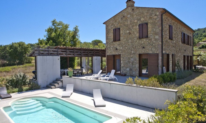 This villa is designed with modern comforts while preserving the rustic charm typical of Tuscan architecture. Featuring three spacious bedrooms, including a master suite with a king-size bed, and two luxurious travertine-marble bathrooms, your guests will enjoy both style and comfort. The open-concept kitchen and living room create the perfect gathering space, while the private swimming pool offers a refreshing retreat. Additional amenities like free WiFi, BBQ facilities, and family-friendly features ensure a delightful experience for all wedding parties and their guests.