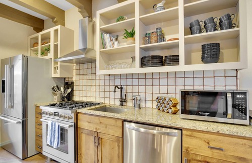 The kitchen is definitely a highlight - light and bright with the wonderful charm of a Spanish hacienda. It is fully stocked with everything from Instant Pot, to mixer, to pantry that is stocked with all the staples you'll need.