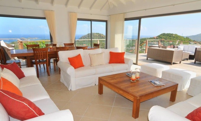 Villa Mirador, also known as WV ING, is a 4-bedroom villa located in Colombier within a short drive to the beach and shopping. This hillside villa offers stunning views of the ocean and countryside. This house is nicely decorated, offering a welcoming living room with comfortable sofas. The large living and dining area opens onto the terrace with ocean views beyond. An outdoor dining area on the terrace is the perfect spot for long dinners under the stars. At the back of the villa is a modern, well-equipped kitchen. All 4 bedrooms are independent of each other. Three bedrooms each have a king-size bed with en suite bathroom. The fourth bedroom has twin beds and an en suite bathroom. All of the bedrooms open onto a terrace with a view. A large terrace with lounge chairs surrounds the pool, making this a pleasant area for either entertaining guests or sunbathing. The house also has WiFi, a gas grill, and U.S. satellite TV. Villa Mirador comes with house cleaning services six days a week, except on holidays. During the December holidays, the villa rents at the full occupancy rate regardless of how many bedrooms are used. This villa is suitable for young children