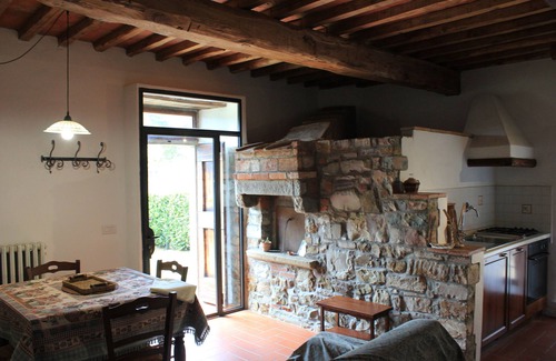 Poggetta's main entry is an arched doorway that leads to a living room with an open fireplace, sofa, sat-TV and CD and DVD-player.