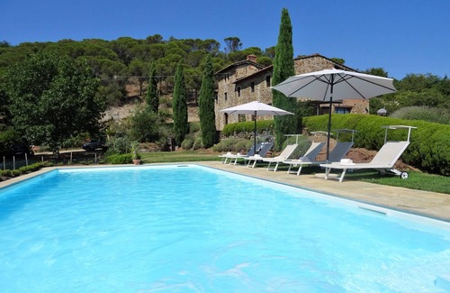 Nestled amid vineyards, in the heart of Tuscany, the beautiful farmhouse is a typical rural stone building with private pool (13 x 5,5 m), for up to 9/10 people.
