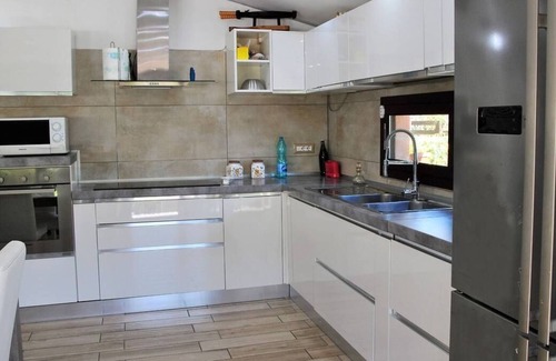 Outside, the main house has is a patio with a barbecue area, pizza oven, hob, and an outdoor dining area (with table and chairs) and the dependence also has a nice patio with a table, umbrella, barbecue, and lawn. The garden (500 sqm) with a lawn, palm, and banana trees) features a swimming pool (6.10 x 3.75m; depth 1.2m), children’s playground (with a swing, slide, trampoline and jumping chairs), an outdoor shower and a bathroom (with toilet and washing machine). Private parking inside the property is also available.