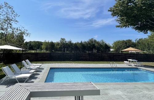 Freshly renovated Orient Village designer gem with heated pool on a private, one acre vineyard.3.5 bedrooms, 3 bathrooms with massive common area. Guest Room/Den/Office/Playspace with pullout couch. Brand new top-of-the-line chef's kitchen with deck overlooking vineyard. Screened-in porch. 2 minute walk to private beach & historic Orient Village. Heated Pool, Central air, Washer/dryer, high speed internet, TVs with streaming video, gas BBQ. Great layout for a family + grandparents/nanny. Don't miss out on the perfect North Fork escape. Book now!