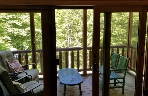 - Screened in back porch with 2 outdoor recliners and bench overlooking trees and water