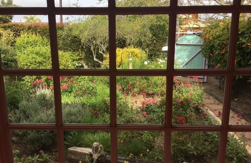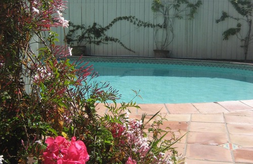 Walk to the ocean, nature preserve, restaurants, and stores from this quiet & bright separate wing of house surrounded by gardens & pool. Your own gate and private entrance open to 2 bedrooms & 2 baths, with many handcrafted features. Microwave & small refrigerator (no kitchen). One bedroom has a full size bed, bureau, and desk, w/ skylight and French doors to the garden. The second has a futon couch, chair, a twin bed, handcrafted bureau and desk, & a direct sunny view of the front garden. Feel free to read in the back yard or to take a swim in the pool after 1pm. To reach the 2nd bedroom, you need to walk through the 1st bedroom. Beach access is 3 blocks away and down a steep flight of steps. At high tide, you need to drive 1/2 mile to a wider part of the beach.)