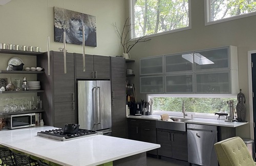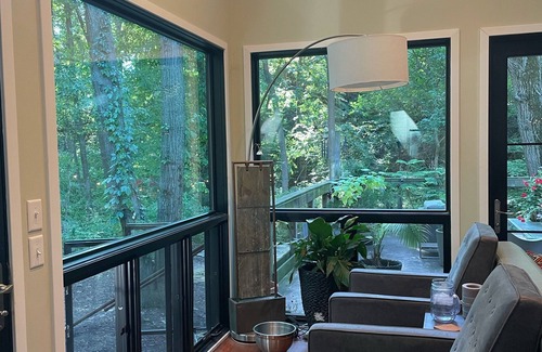 Your friends and family will enjoy 15 ft. tall windows with a spectacular view, modern well equipped kitchen, open living space, stone fire pit under the trees, a large deck, family room with 80 inch smart tv, and a beautiful outdoor fire pit to hang out on those cooler nights.