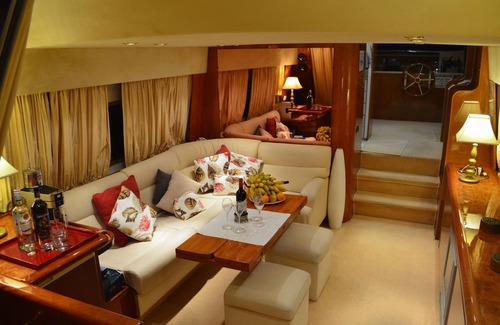 she has 3 luxurious cabins with port hole, mirror, cupboards, music system, quality bedding and with ensuite bathroom, she can accommodate up to 6 guest, large saloon with TV, music system, DVD, indoor dinning table