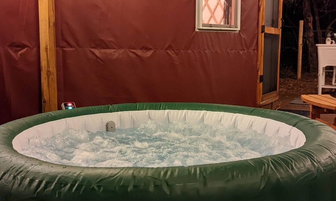 Outside you will find a small firepit area with all logs, fire starters, magic fire color packets are all included. The outside kitchen has hot water, pots, and a grill with a burner. Lastly, the bath house has an outside shower (not heated), sink, and Toilet. There is a top of the line composting toilet that has almost no smell and cleaned/emptied regularly.